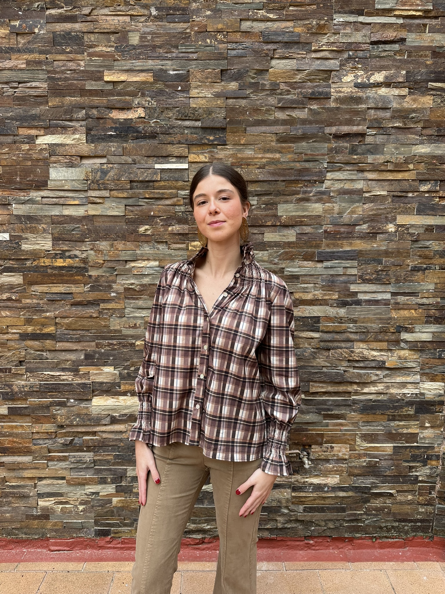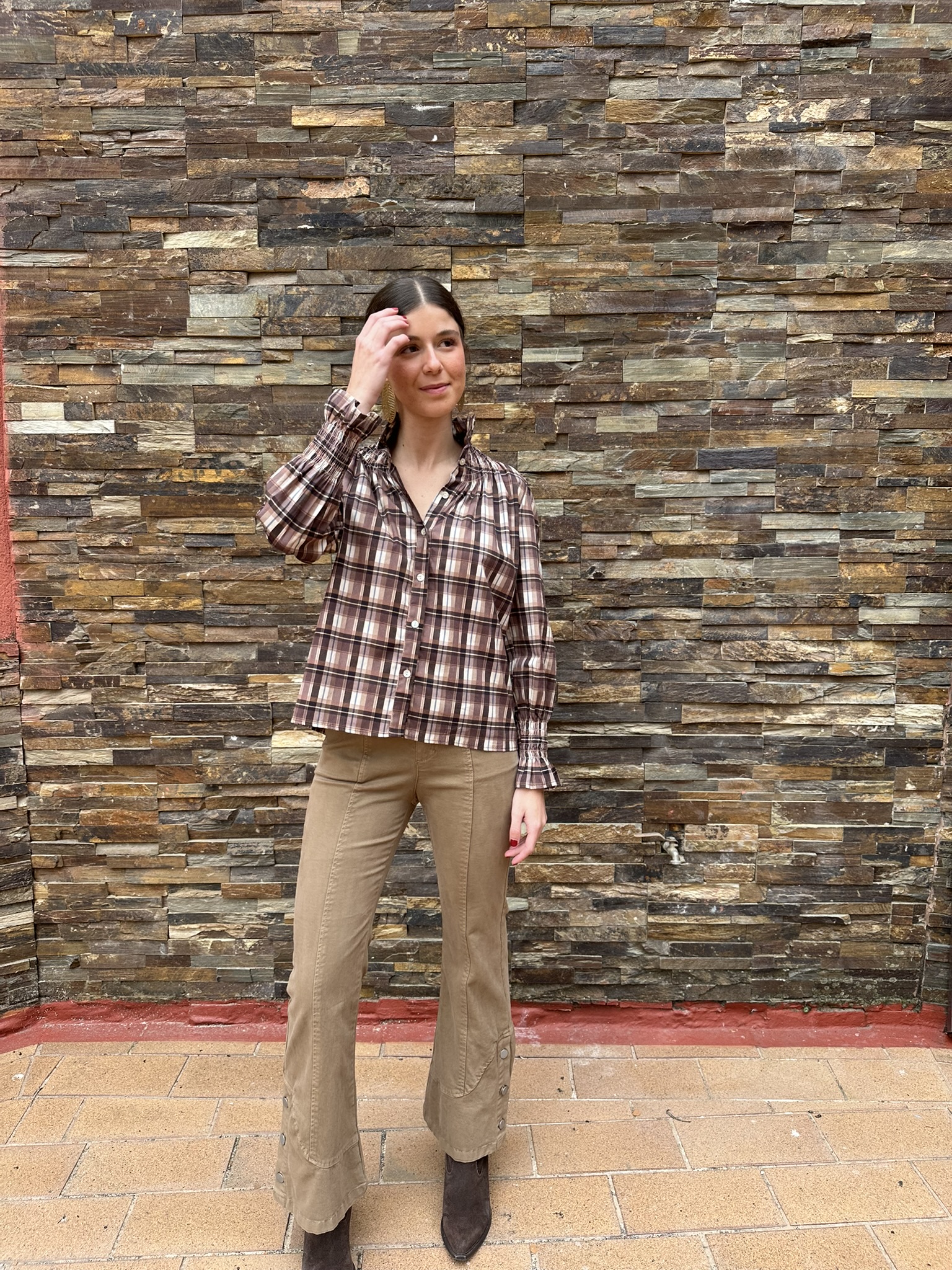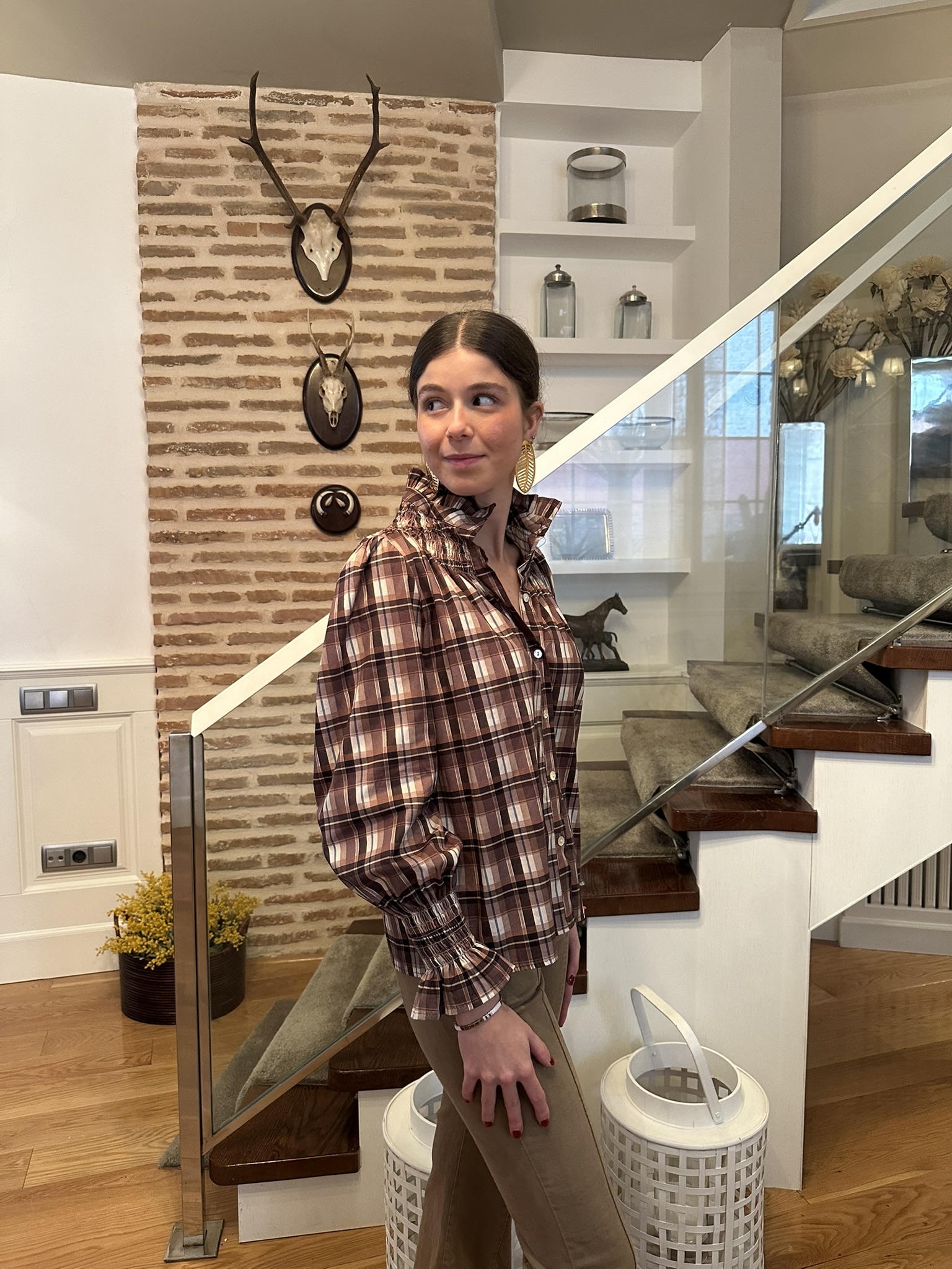Una blusa con encanto clásico y aire femenino. Confeccionada en tejido suave de cuadros en tonos marrones, destaca por su cuello redondo rematado con un delicado volante, detalle que también se repite en los puños. La botonadura frontal y su corte de líneas sencillas la hacen cómoda, favorecedora y muy combinable.