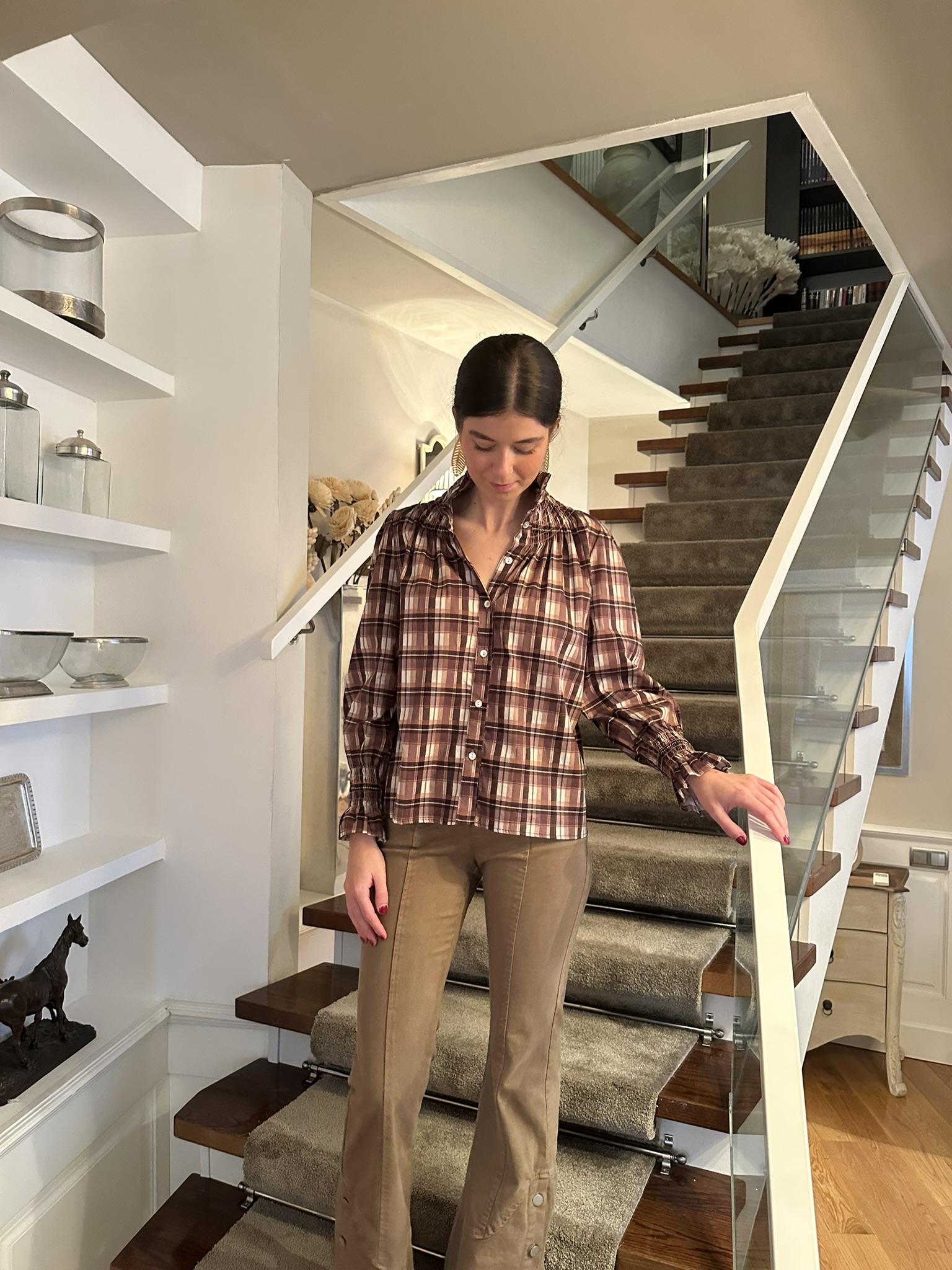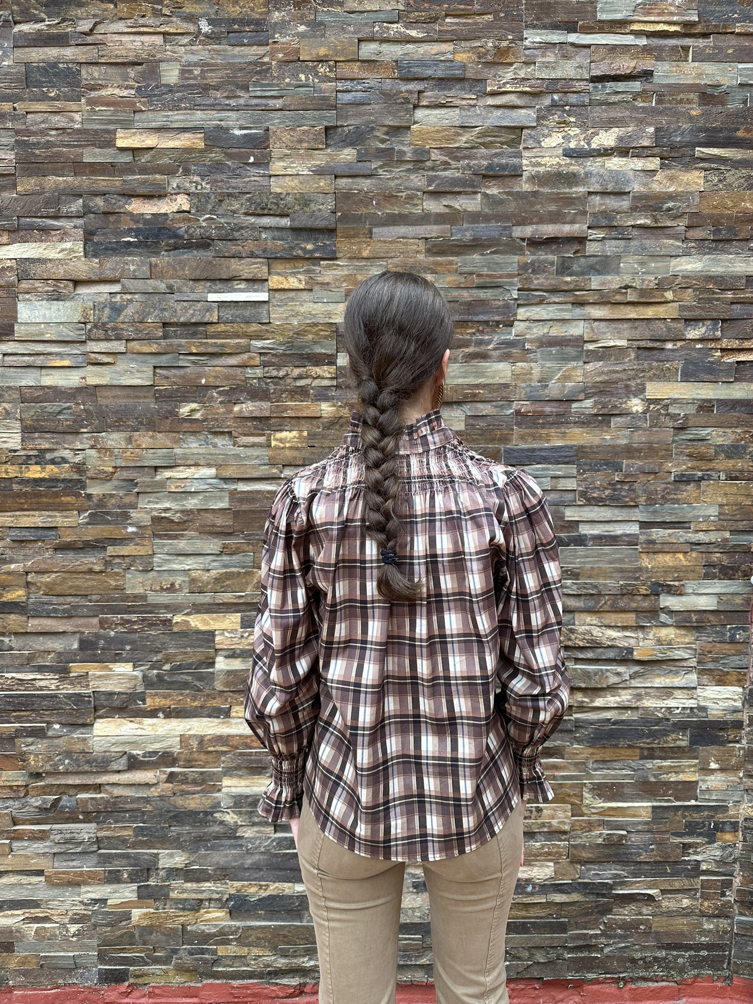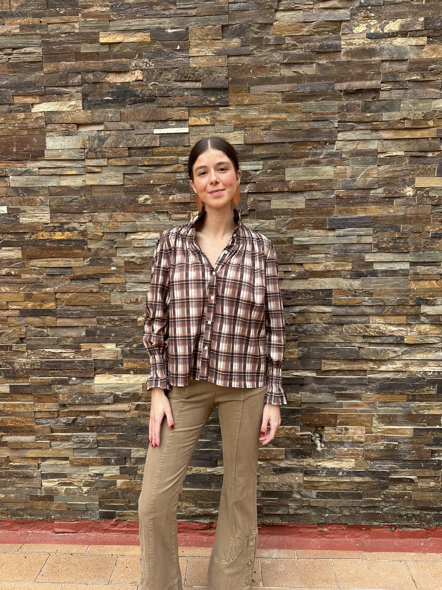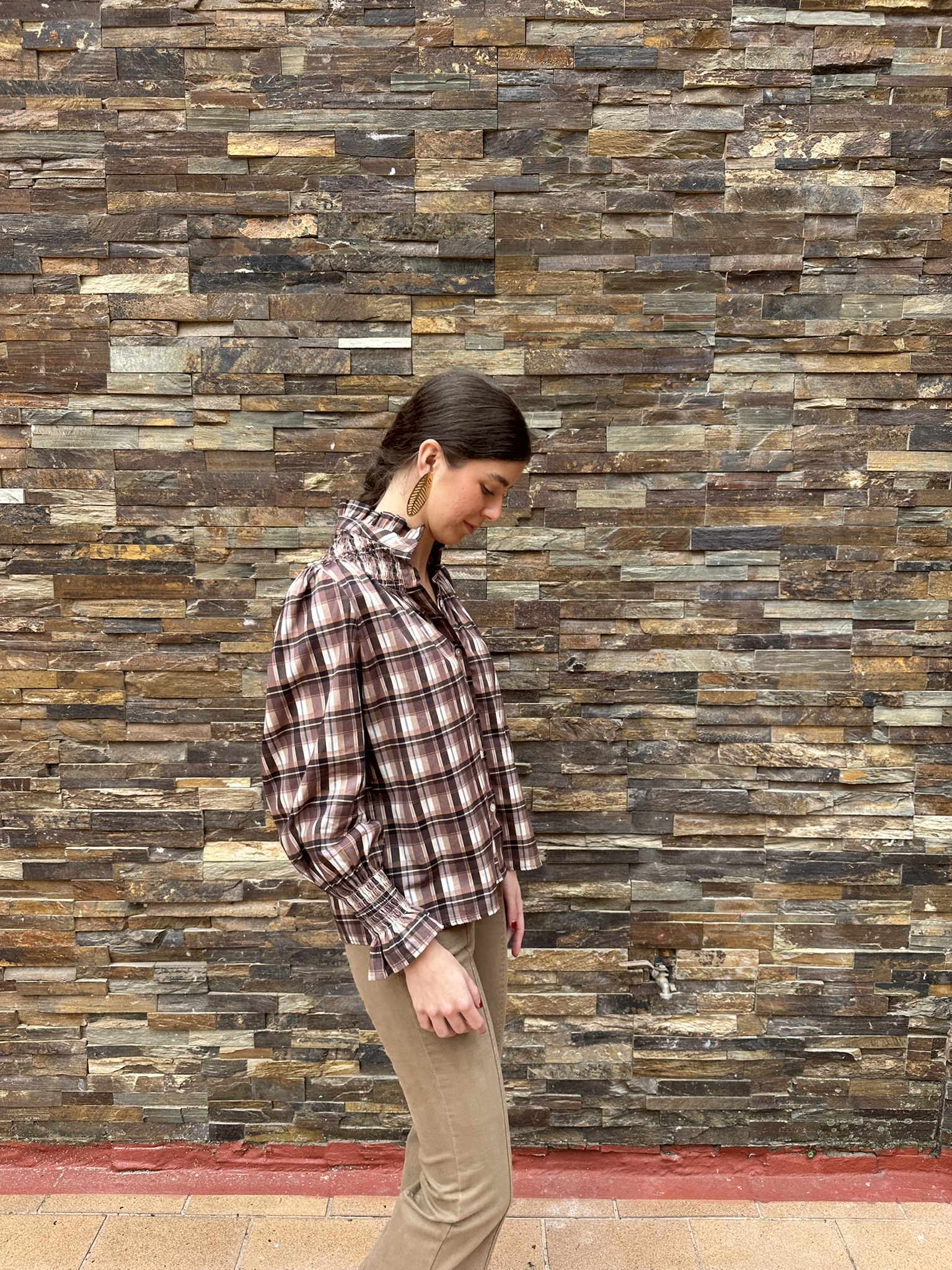 Una blusa con encanto clásico y aire femenino. Confeccionada en tejido suave de cuadros en tonos marrones, destaca por su cuello redondo rematado con un delicado volante, detalle que también se repite en los puños. La botonadura frontal y su corte de líneas sencillas la hacen cómoda, favorecedora y muy combinable.