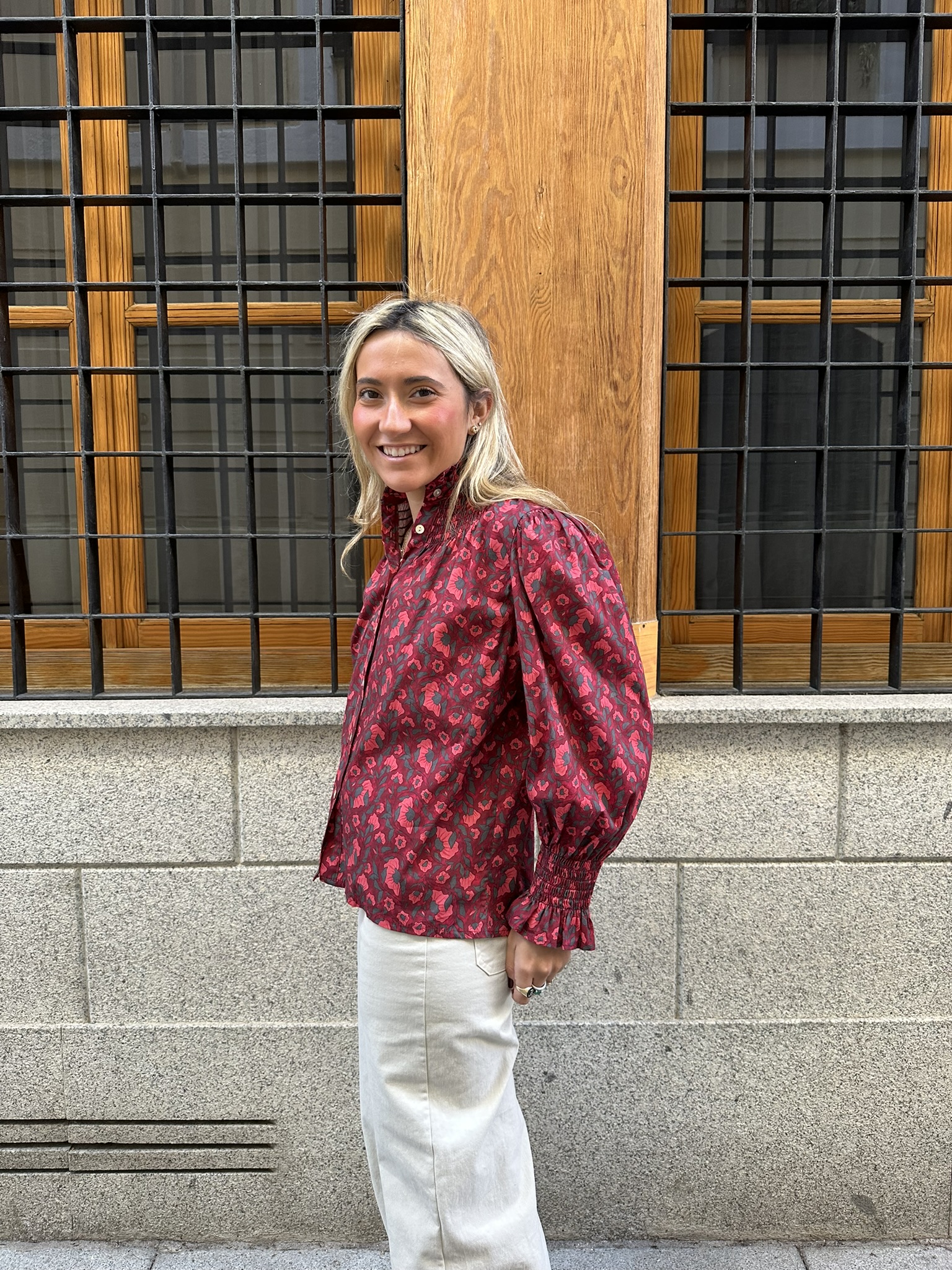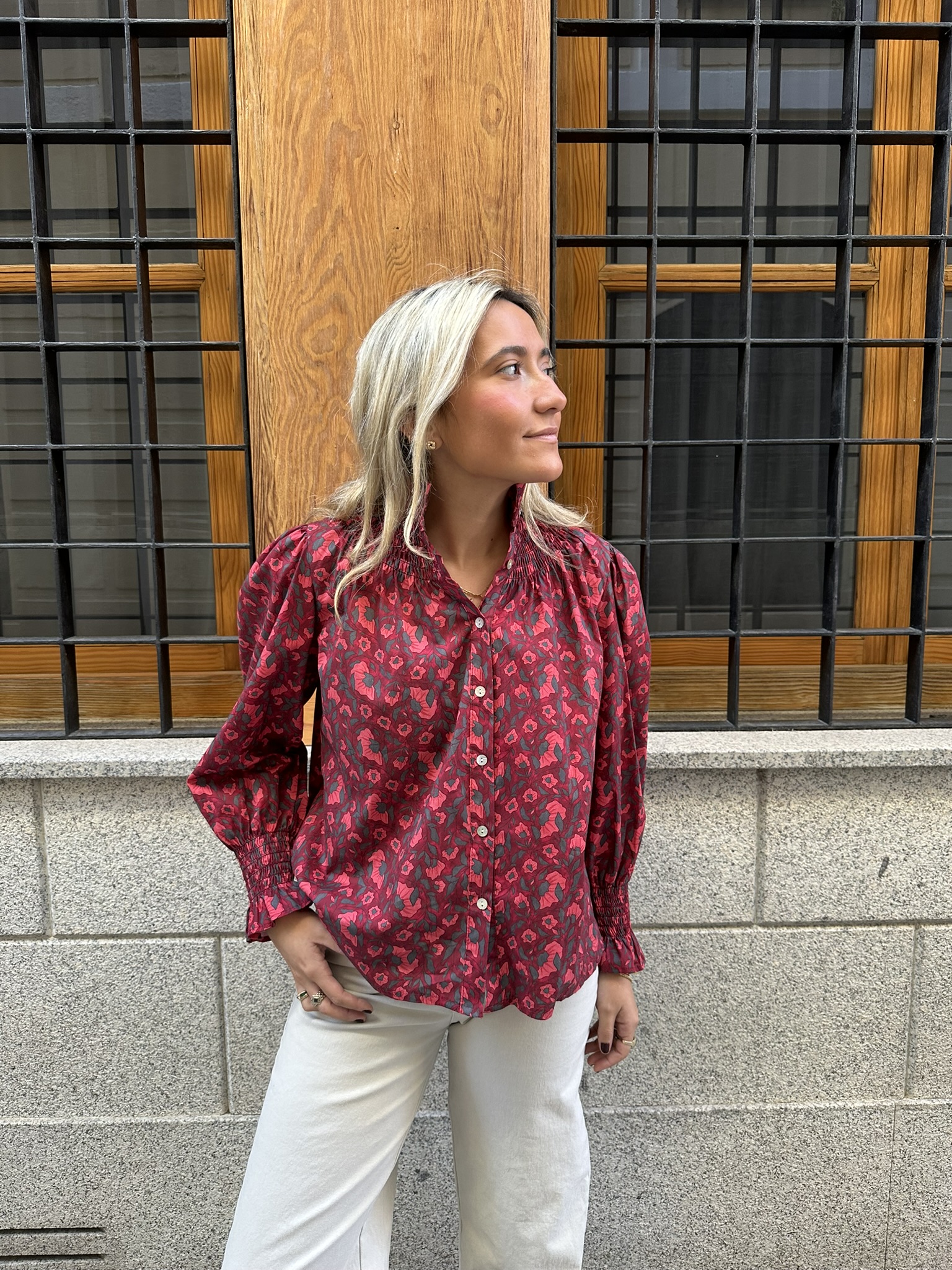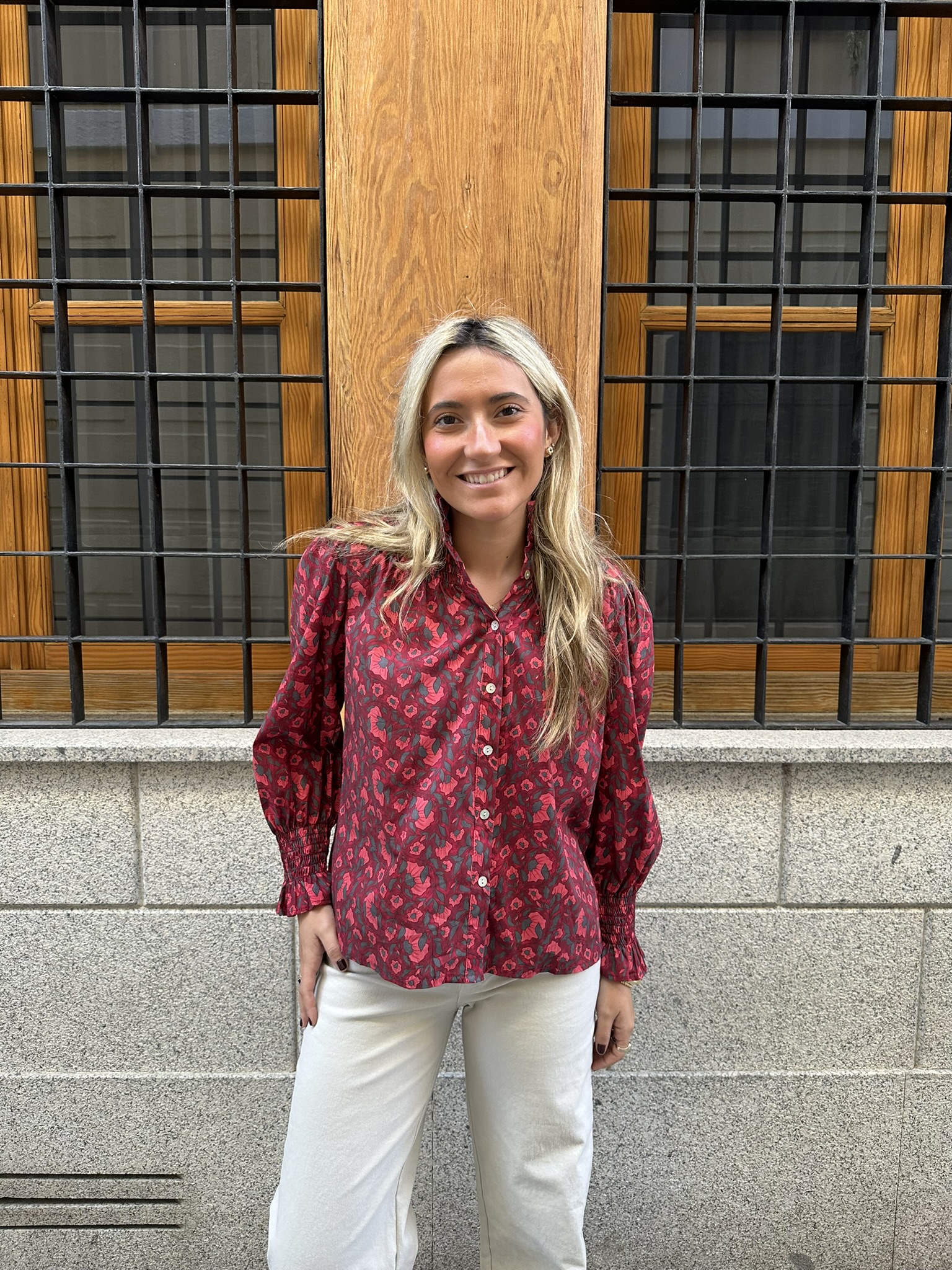 Romántica, suave y muy favorecedora, esta blusa con estampado floral en tonos rosas es una de esas piezas que elevan cualquier conjunto. Su diseño sigue la estructura de nuestra blusa escocesa, con botonadura hasta el cuello, fruncido y volantes sutiles tanto en el cuello como en los puños, que aportan un aire sofisticado sin renunciar a la comodidad. Confeccionada en un tejido fluido y ligero, es ideal para combinar con vaqueros, faldas o pantalones de vestir. Una blusa femenina y elegante que respira frescura y dulzura, perfecta para la mujer actual.