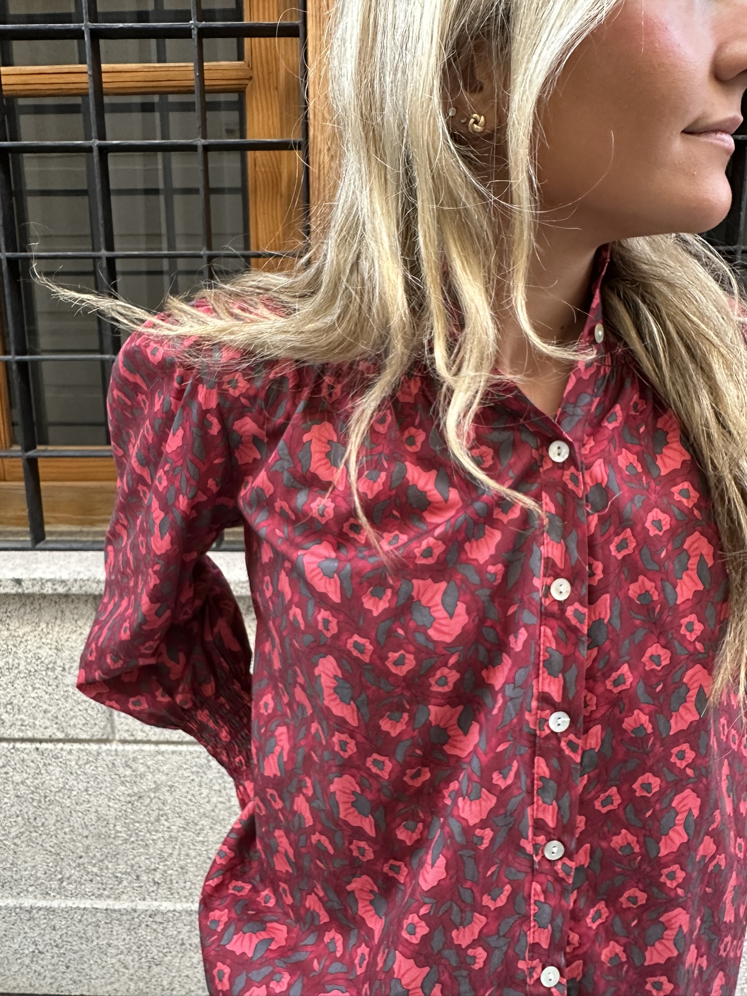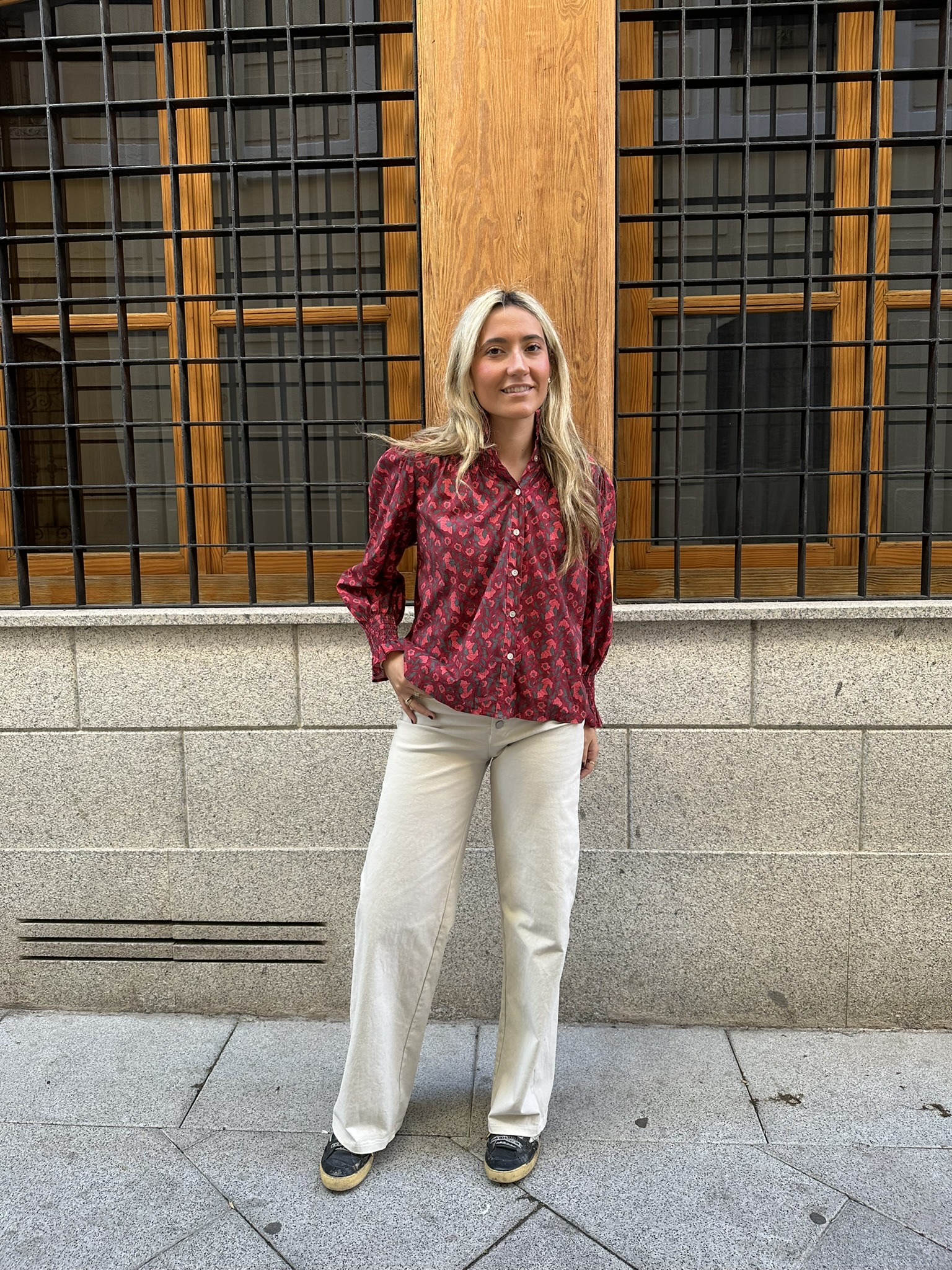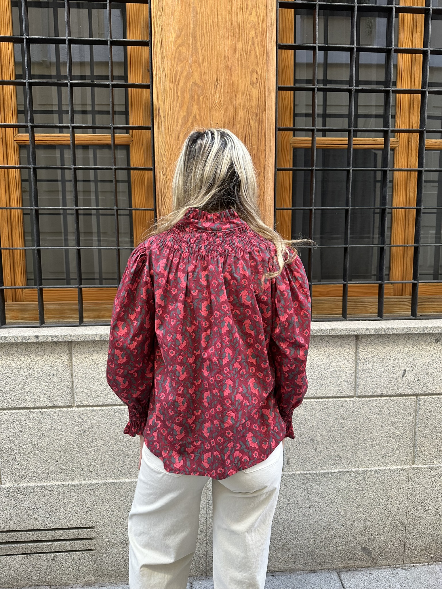 Romántica, suave y muy favorecedora, esta blusa con estampado floral en tonos rosas es una de esas piezas que elevan cualquier conjunto. Su diseño sigue la estructura de nuestra blusa escocesa, con botonadura hasta el cuello, fruncido y volantes sutiles tanto en el cuello como en los puños, que aportan un aire sofisticado sin renunciar a la comodidad. Confeccionada en un tejido fluido y ligero, es ideal para combinar con vaqueros, faldas o pantalones de vestir. Una blusa femenina y elegante que respira frescura y dulzura, perfecta para la mujer actual.
