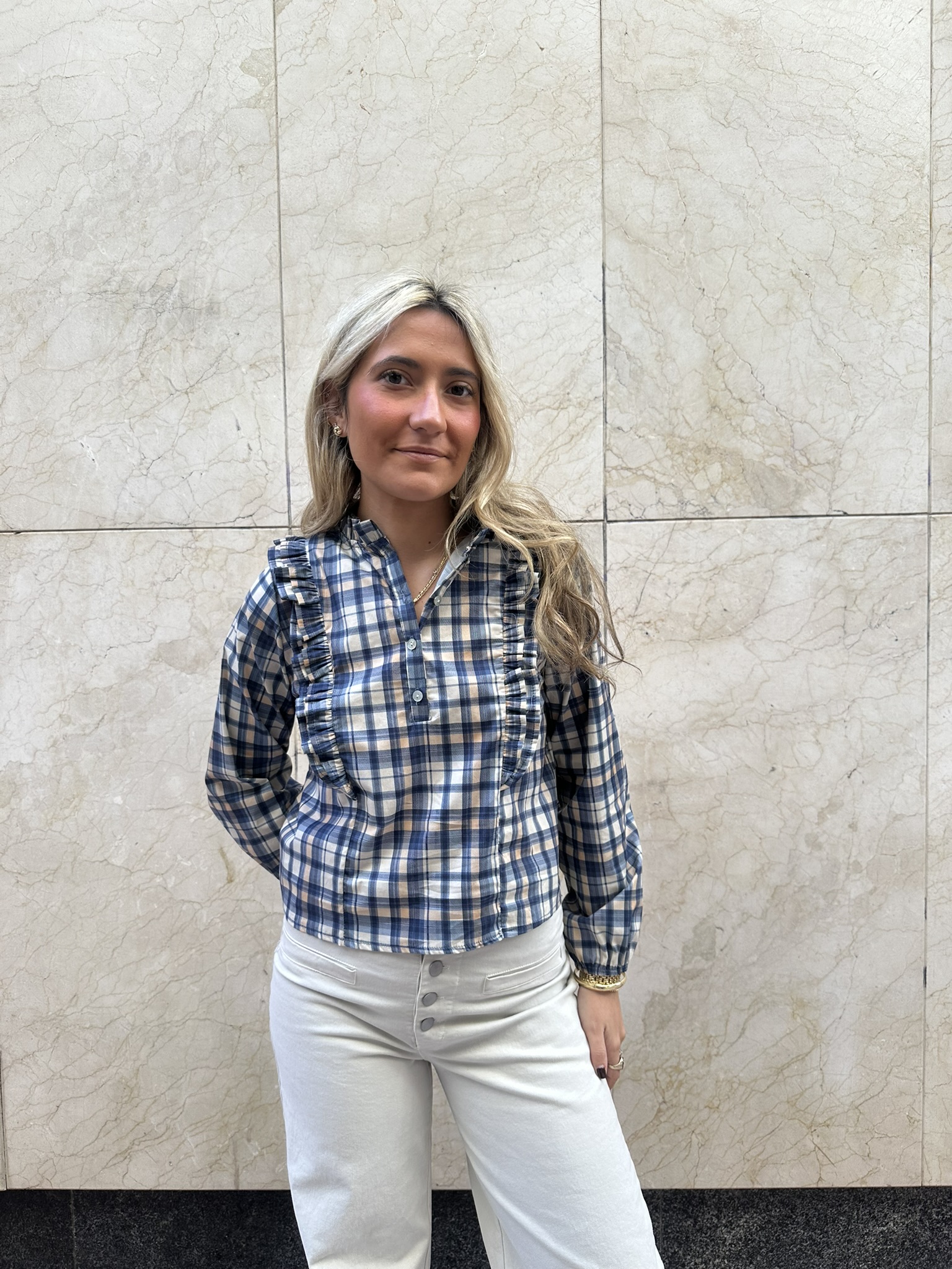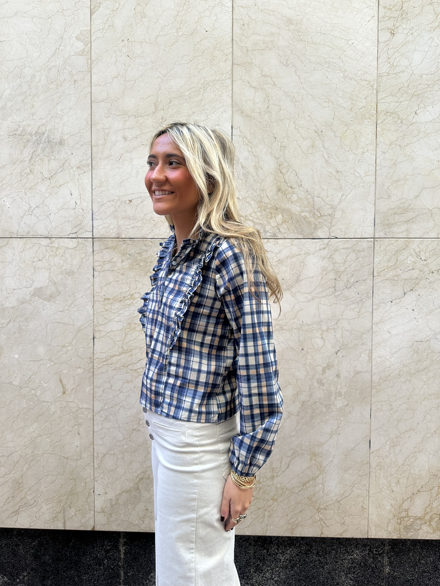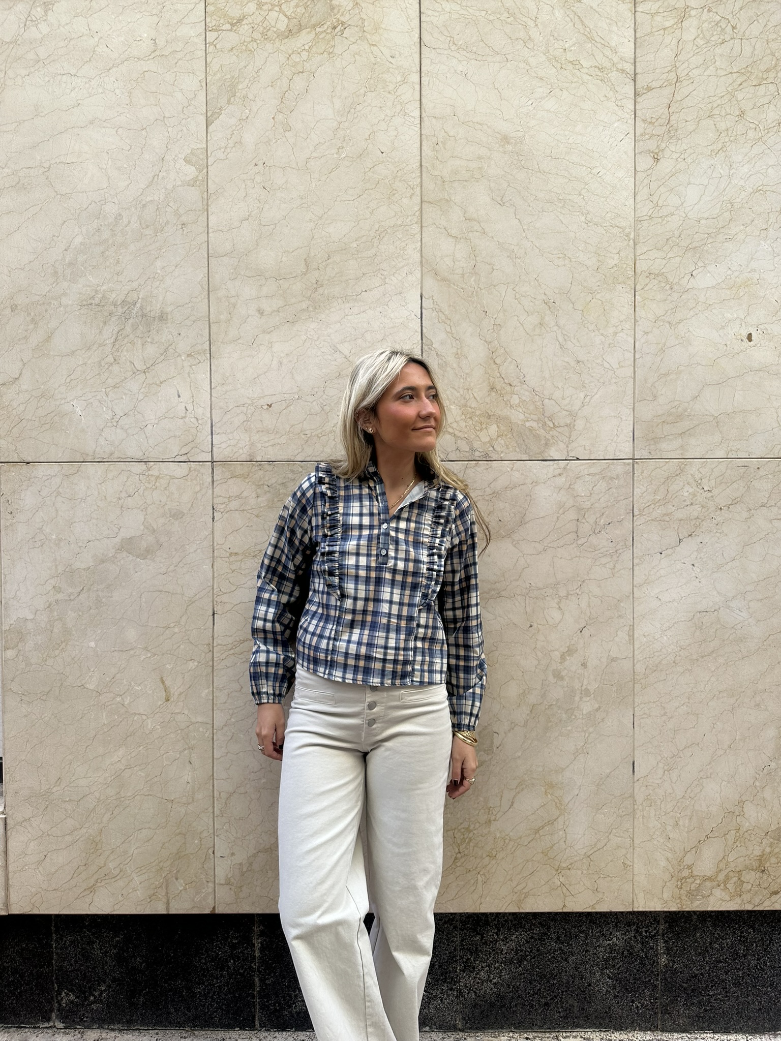 Una blusa pensada para destacar: cuadros en tonos azules, cuello ligeramente subido, y dos volantes verticales en el pecho que estilizan y aportan un punto distintivo. La botonadura a media altura aporta comodidad y un acabado elegante. Es perfecta para looks sofisticados pero frescos, ideal para combinar con vaqueros o faldas lisas. Una prenda favorecedora y versátil, capaz de elevar cualquier outfit.