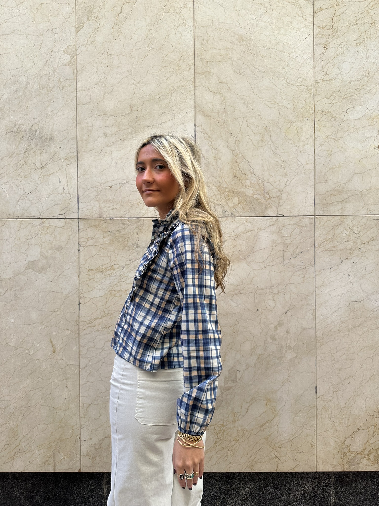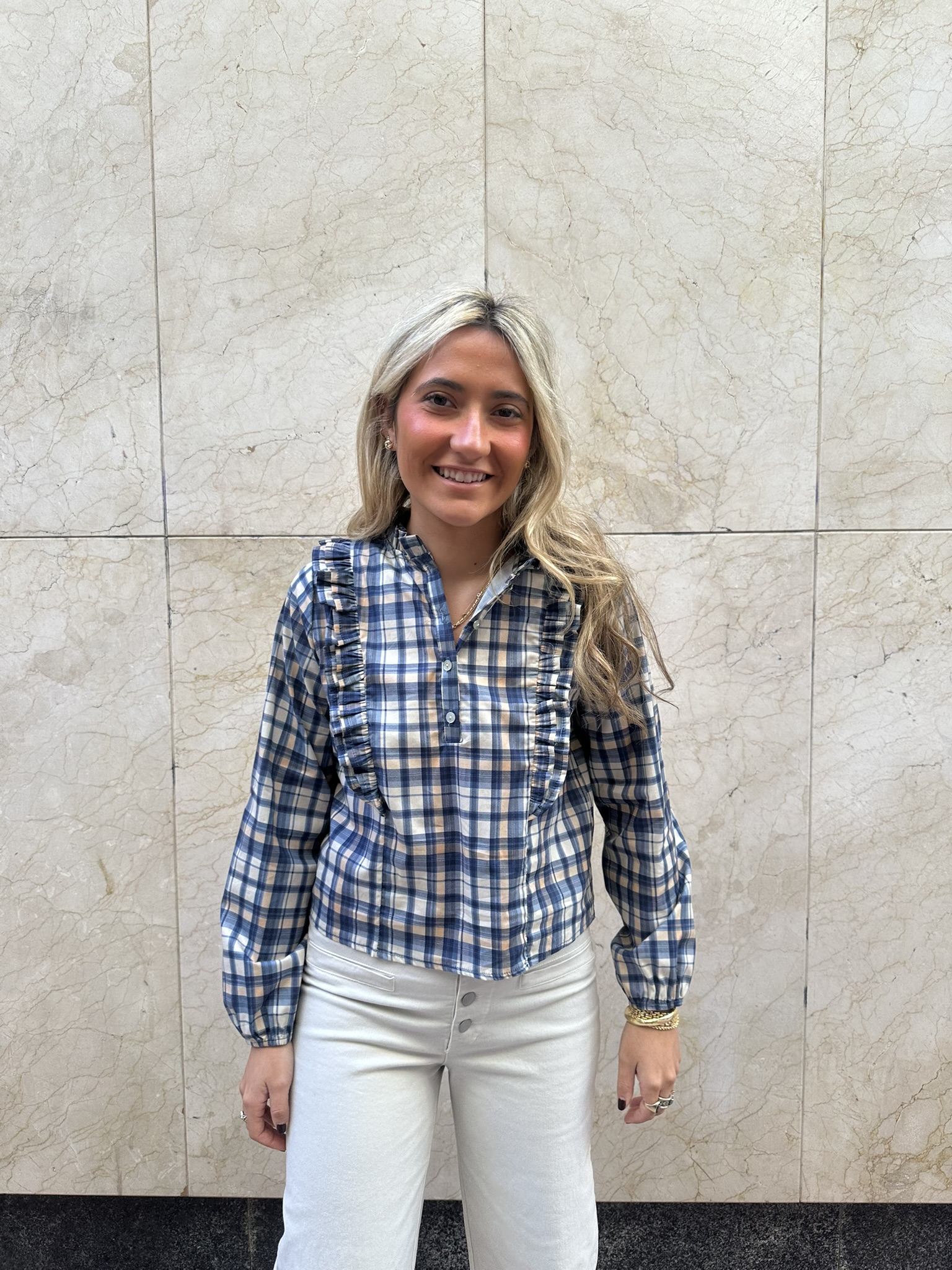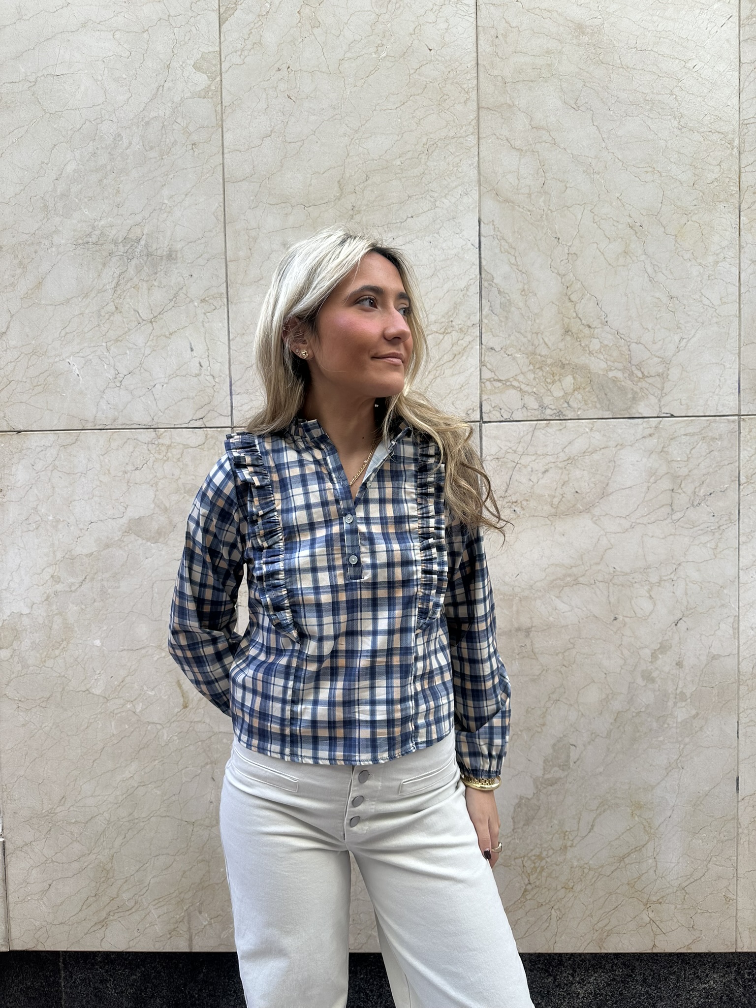 Una blusa pensada para destacar: cuadros en tonos azules, cuello ligeramente subido, y dos volantes verticales en el pecho que estilizan y aportan un punto distintivo. La botonadura a media altura aporta comodidad y un acabado elegante. Es perfecta para looks sofisticados pero frescos, ideal para combinar con vaqueros o faldas lisas. Una prenda favorecedora y versátil, capaz de elevar cualquier outfit.