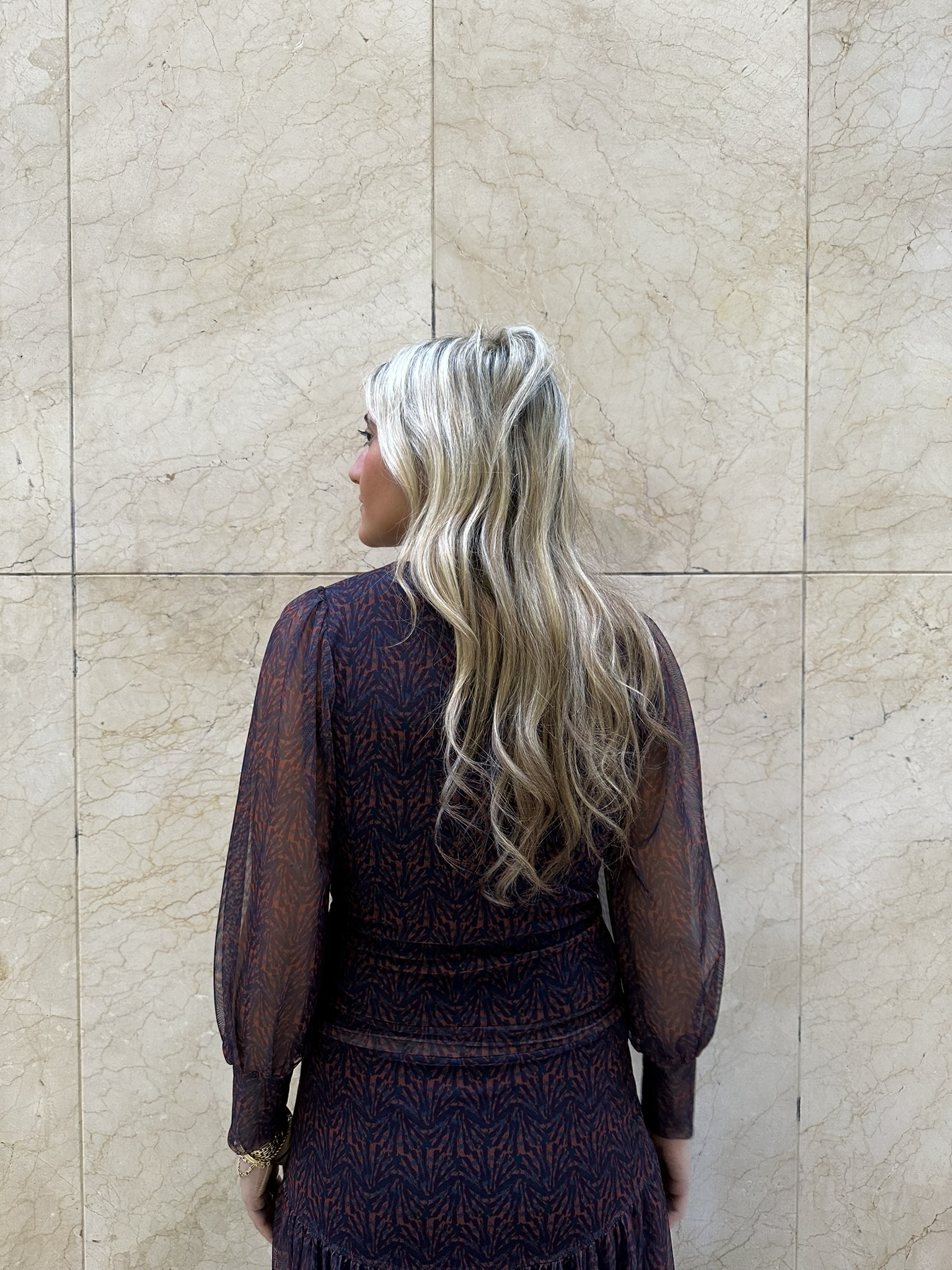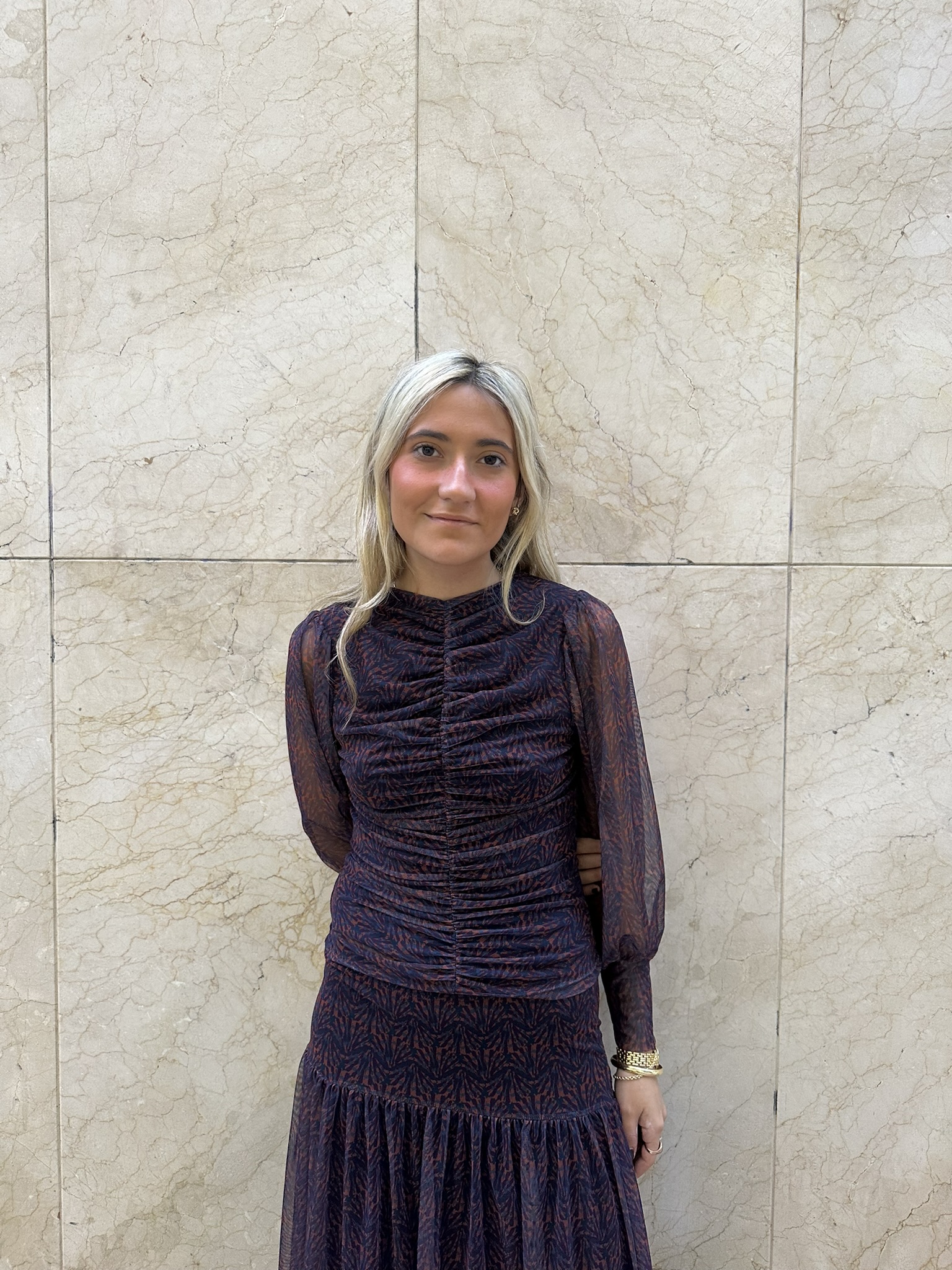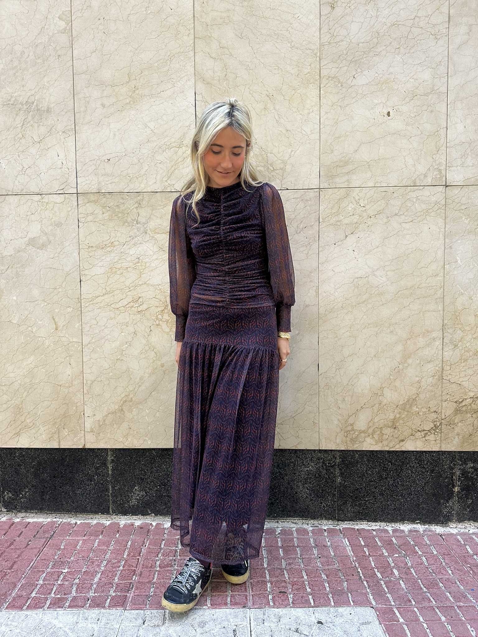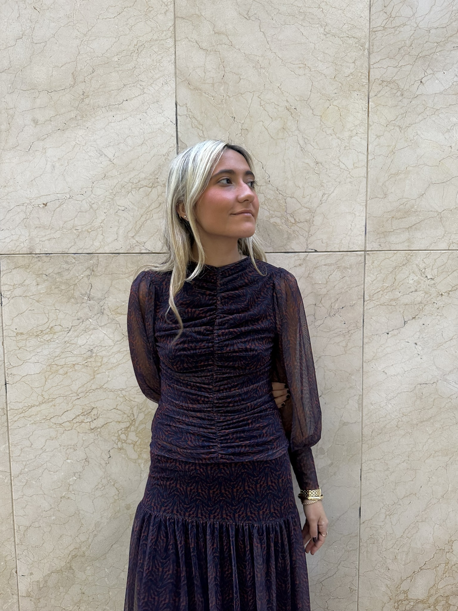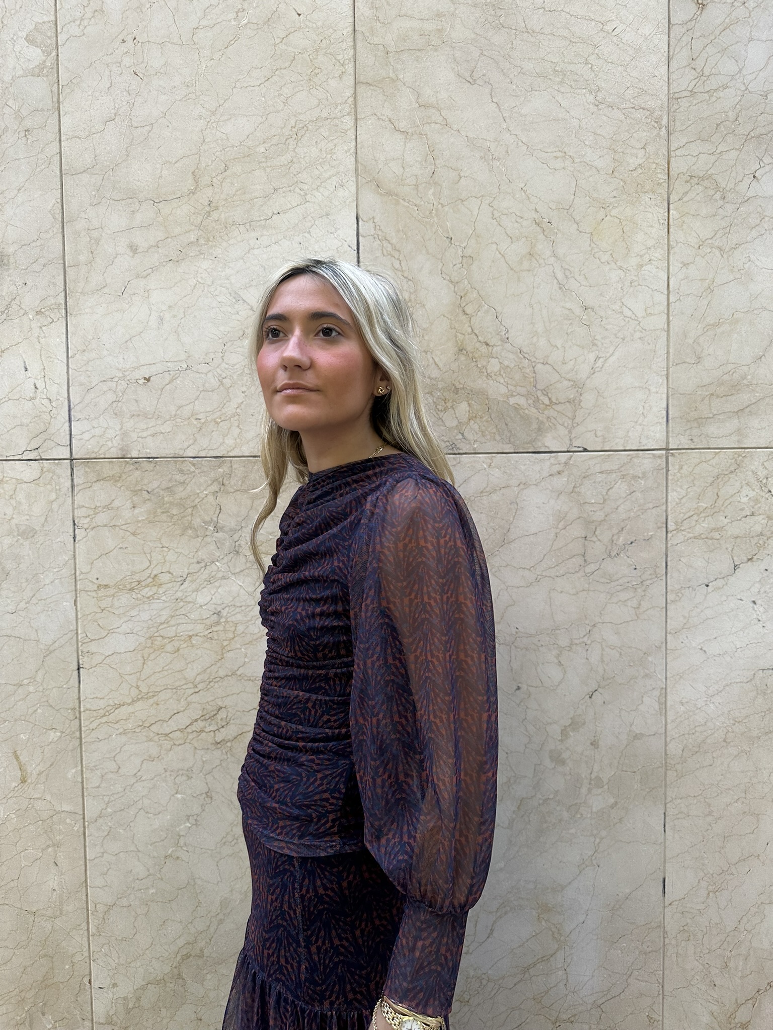 Este top de manga larga en tul elástico es pura expresión de estilo y originalidad. Su diseño multicolor, donde predominan los tonos azules y naranjas, aporta un aire vibrante y contemporáneo, mientras que el fruncido delantero realza la figura de forma sutil y favorecedora. Ligero, cómodo y con un toque sofisticado, es el top perfecto para combinar con su falda a juego o con vaqueros de tiro alto para un look más casual pero lleno de personalidad.
