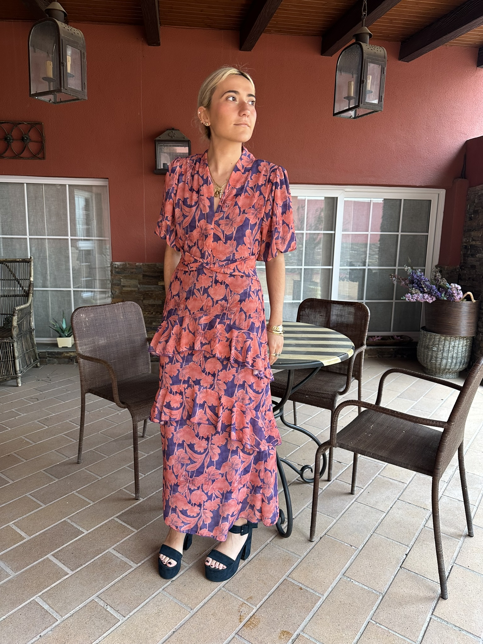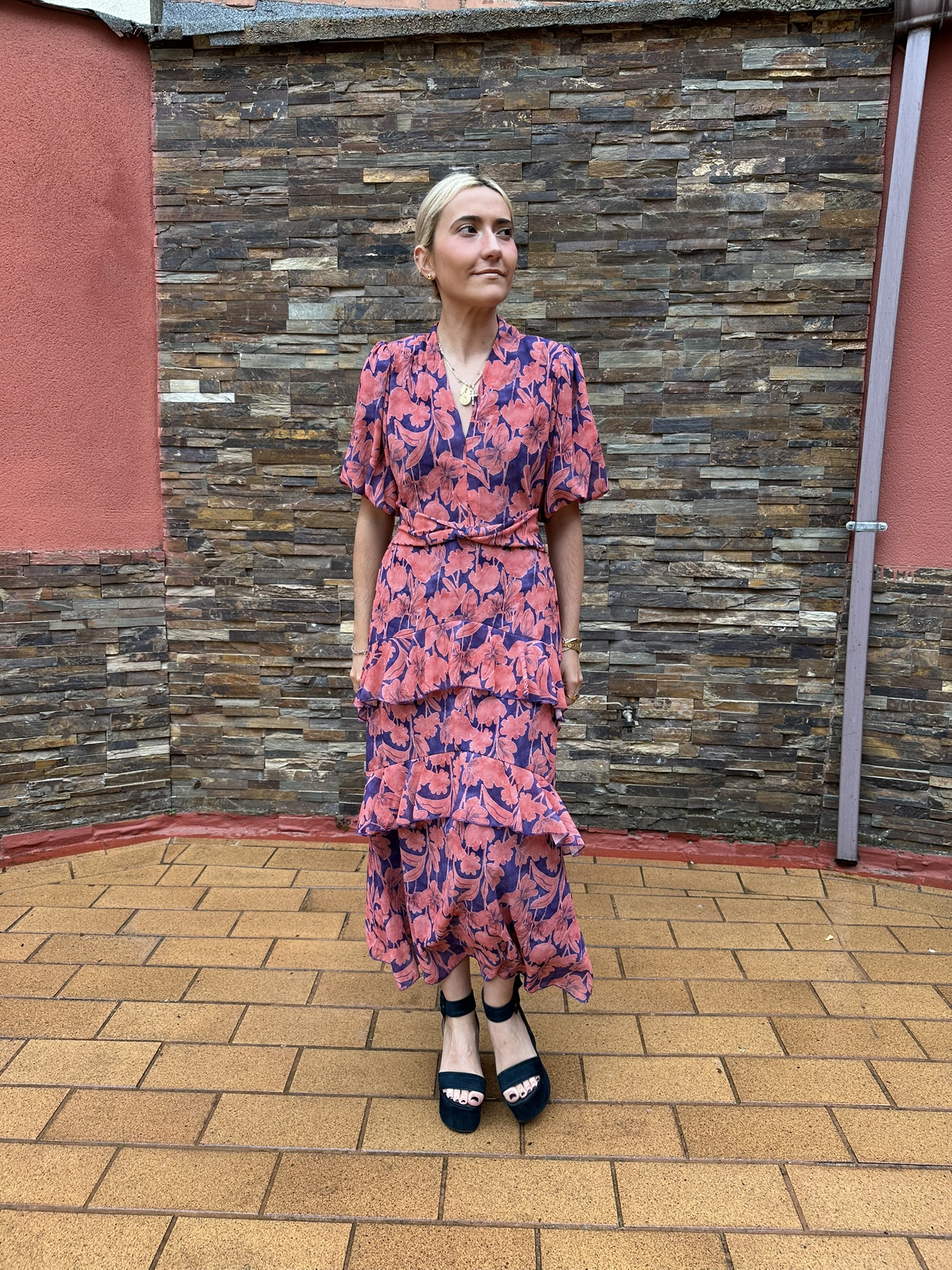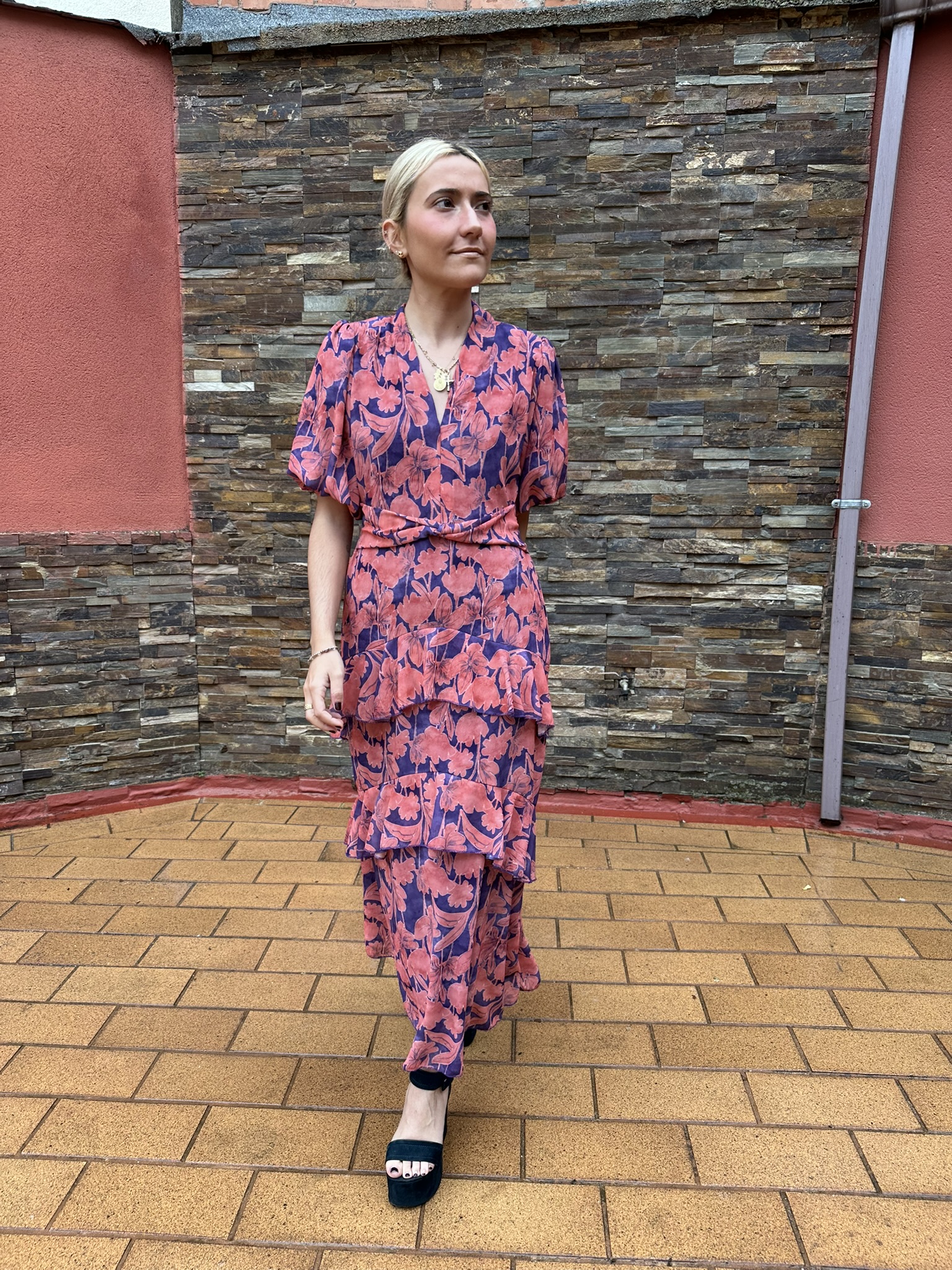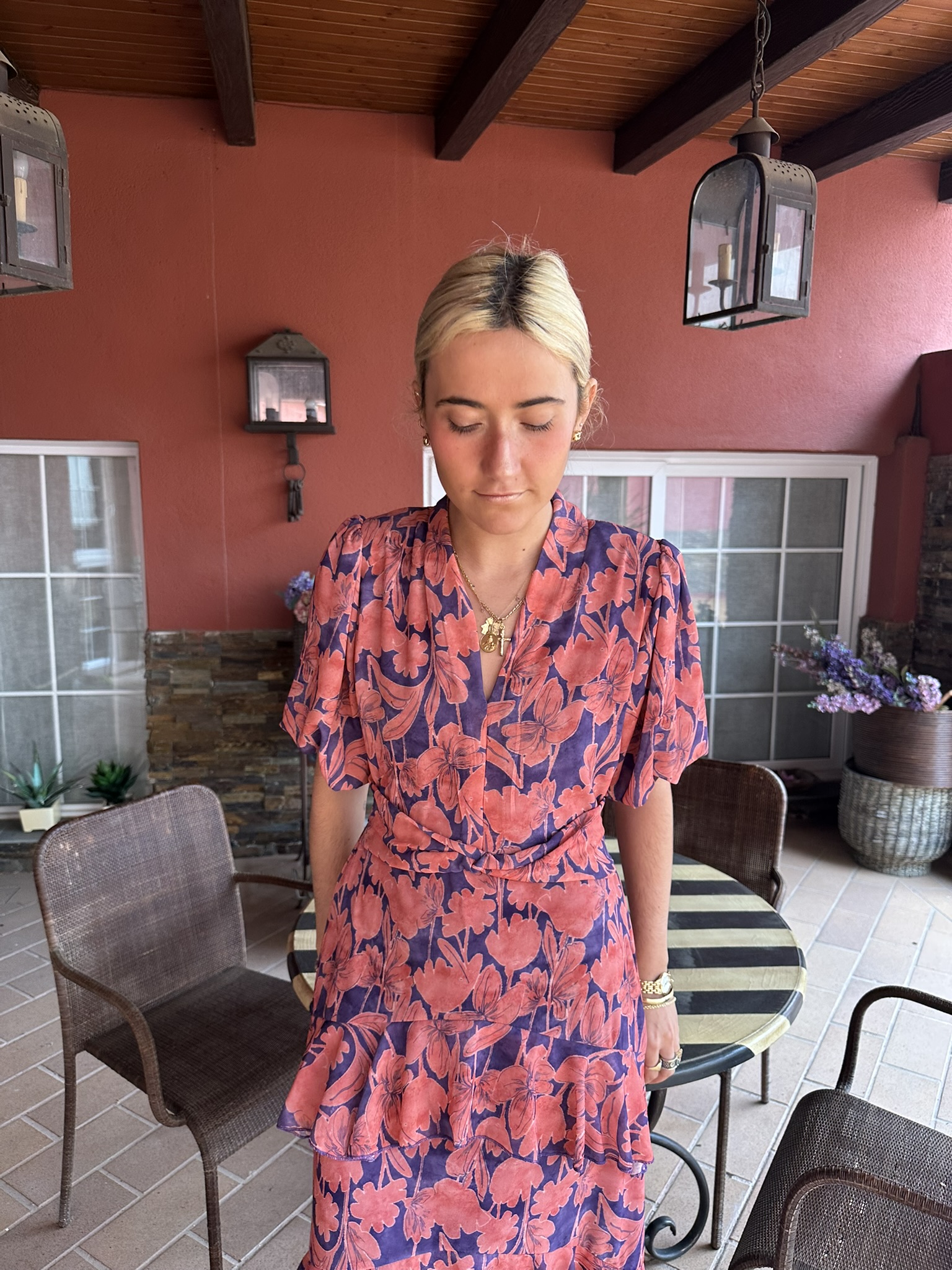 Vestido de gasa con estampado floral en tonos naranja, perfecto para dar luz al look. Cuenta con escote a pico, manga media y cinturilla que marca la figura de forma natural. Los volantes delanteros añaden dinamismo y hacen que la prenda tenga más presencia. Ligero, cómodo y fácil de llevar, es una opción muy práctica para primavera y verano.