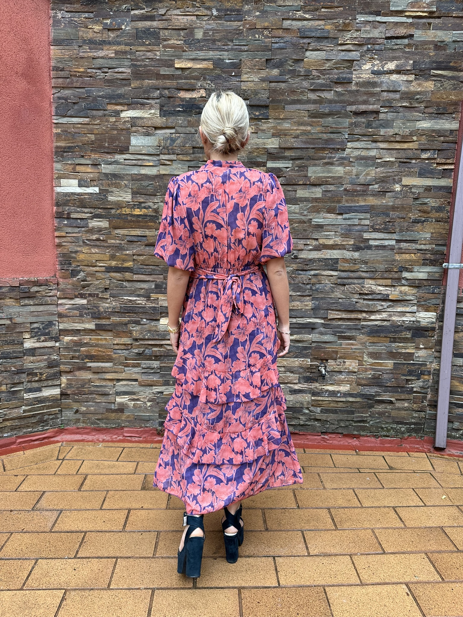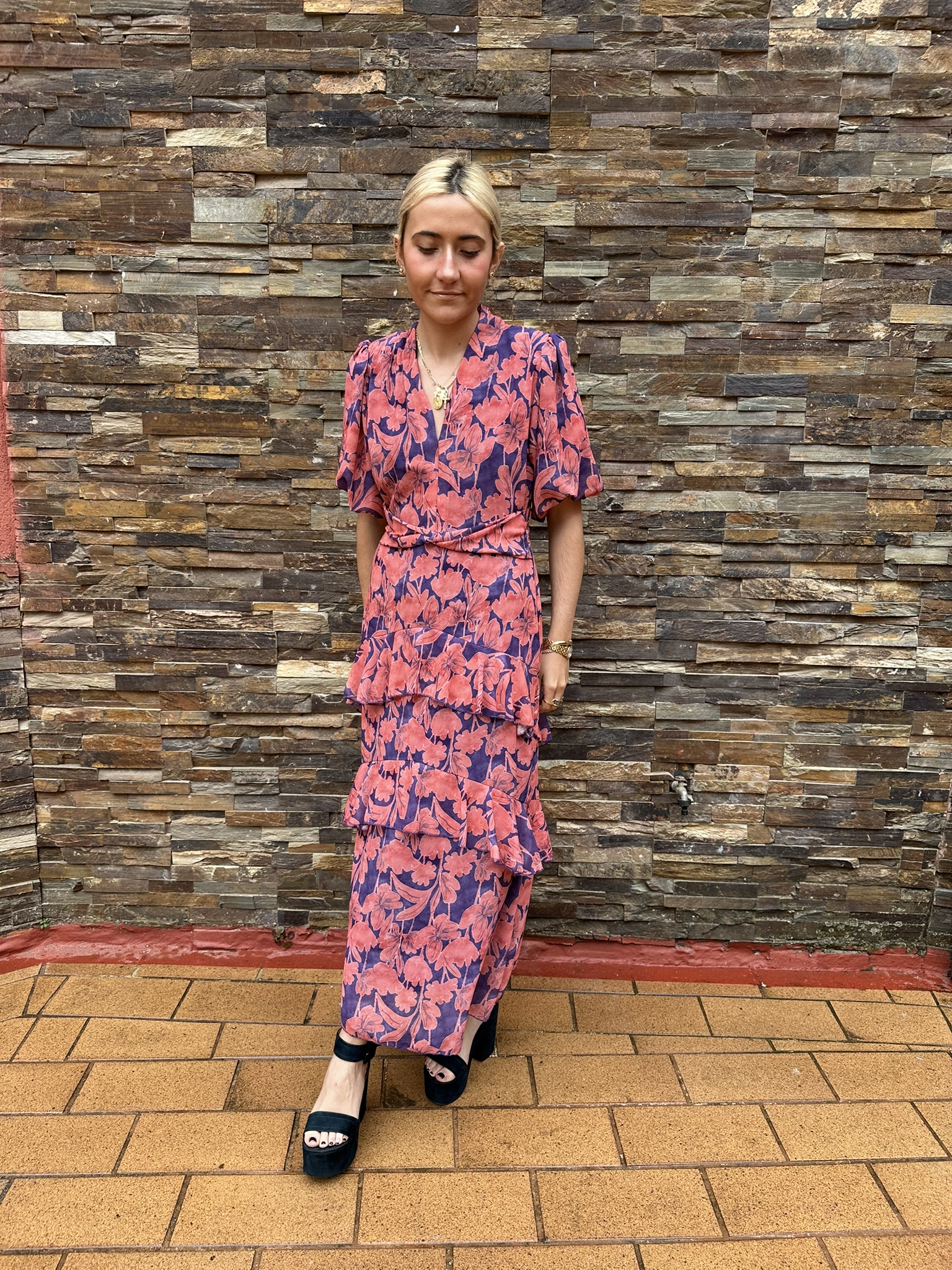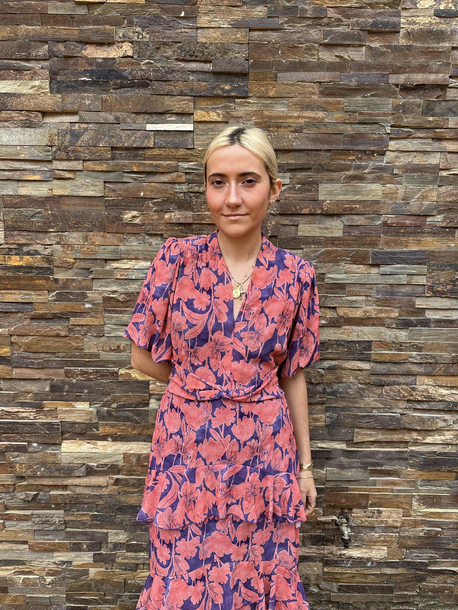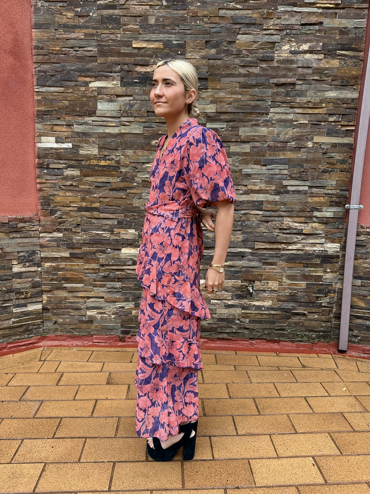 Vestido de gasa con estampado floral en tonos naranja, perfecto para dar luz al look. Cuenta con escote a pico, manga media y cinturilla que marca la figura de forma natural. Los volantes delanteros añaden dinamismo y hacen que la prenda tenga más presencia. Ligero, cómodo y fácil de llevar, es una opción muy práctica para primavera y verano.